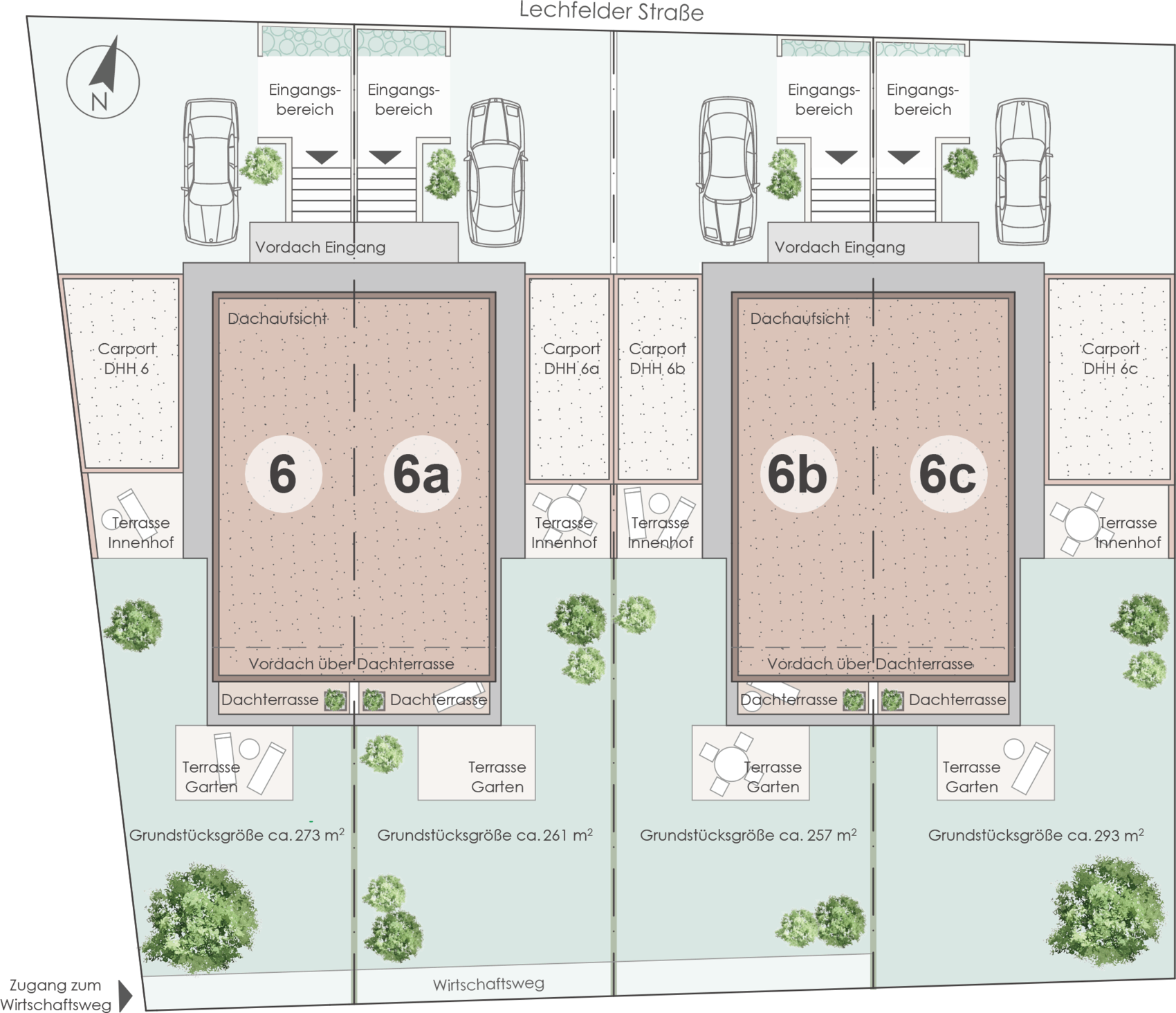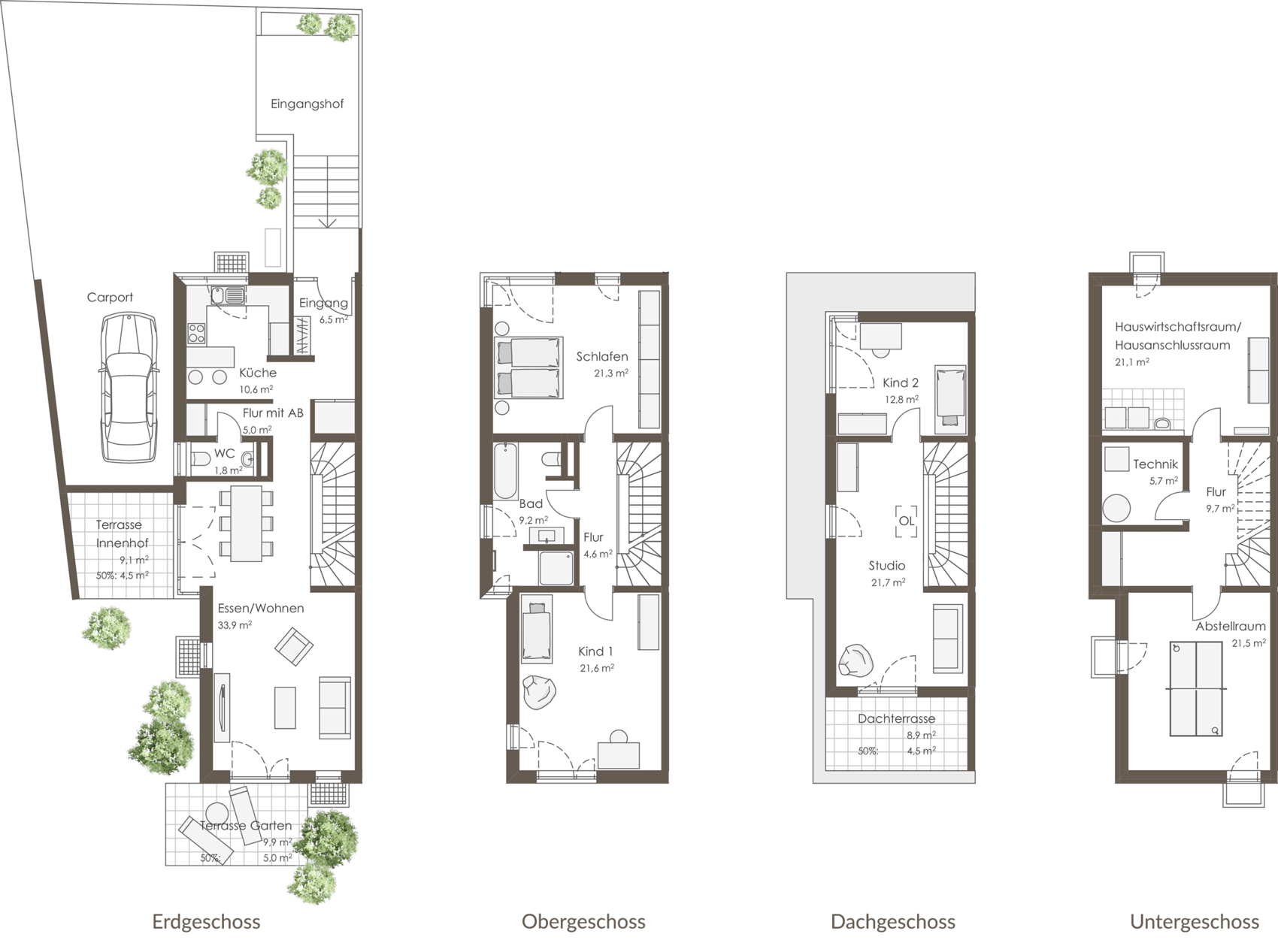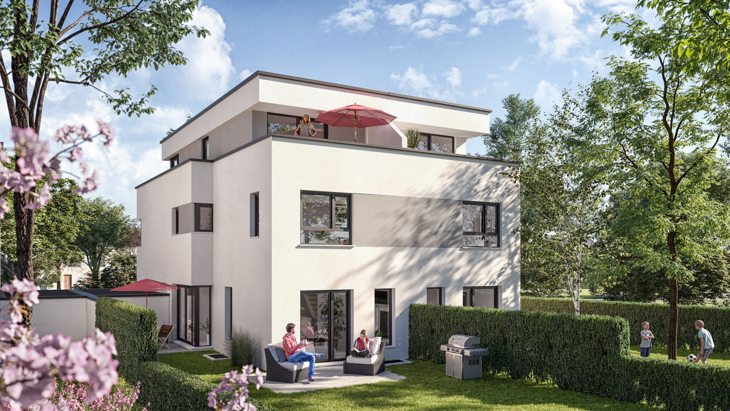 Jede Doppelhaushälfte ist voll unterkellert und verfügt über 3 Wohngeschosse. Das Dachgeschoss bietet eine wunderschöne und private Dachterrasse nach Süden. Eine weitere Terrasse im ruhigen Südgarten sowie ein geschützter Innenhof gewähren Ihnen zusätzlichen Raum für Privatheit und die Möglichkeit zur Entspannung im Grünen.